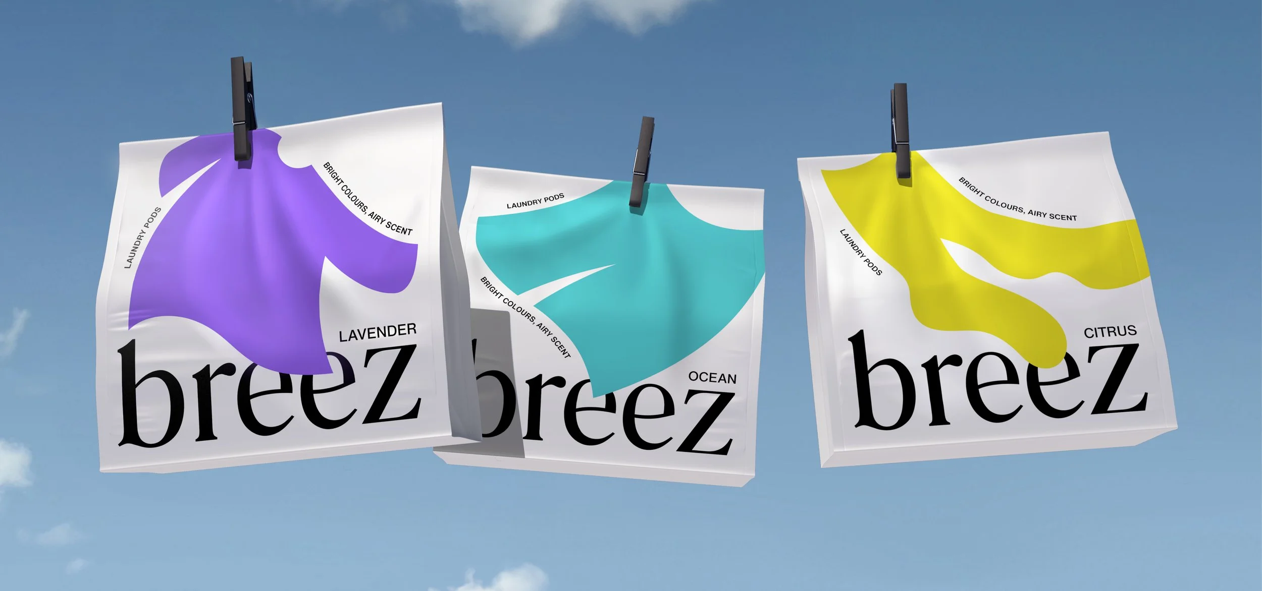 Our goal was to make a strong impact on the shelf and stand out in a saturated market. Breez breaks away from the conventional laundry cues with a packaging so simple it instantly communicates its promise visually. Bright colours, airy scent.